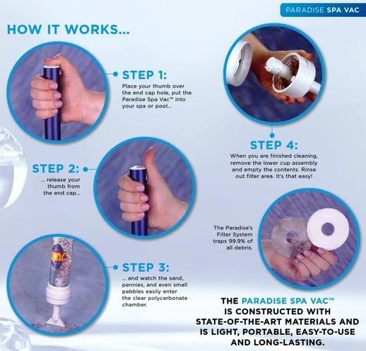Schmutz, Sand, Steinchen, Laub und Gras auf dem Boden des Whirlpools oder Schwimmbades werden ohne Probleme durch den Vakuum-Sauger aufgesaugt. Einfache Bedienung - ohne Strom oder Batterien.
